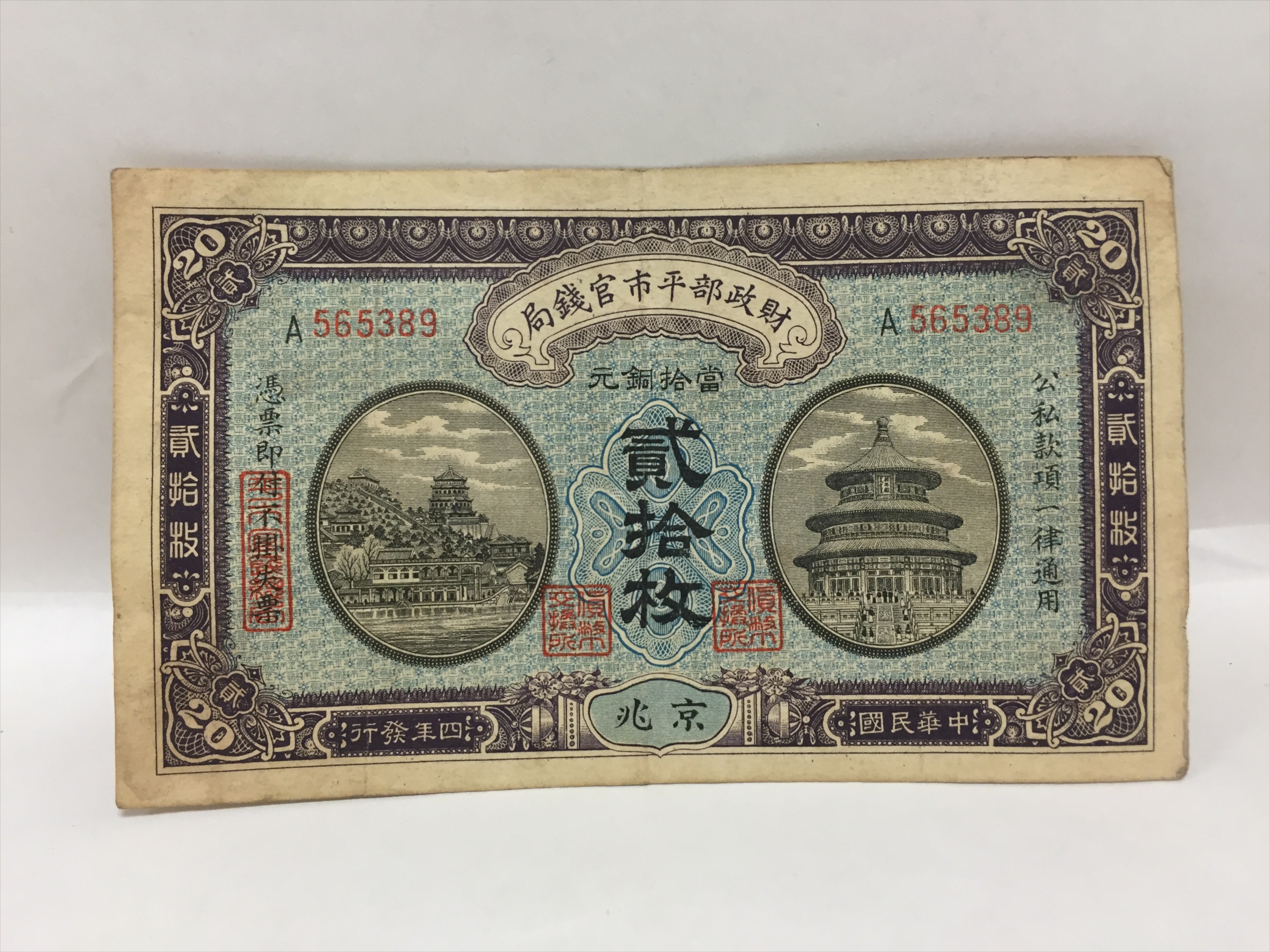 民国四年财政部平市官钱局贰拾枚纸币