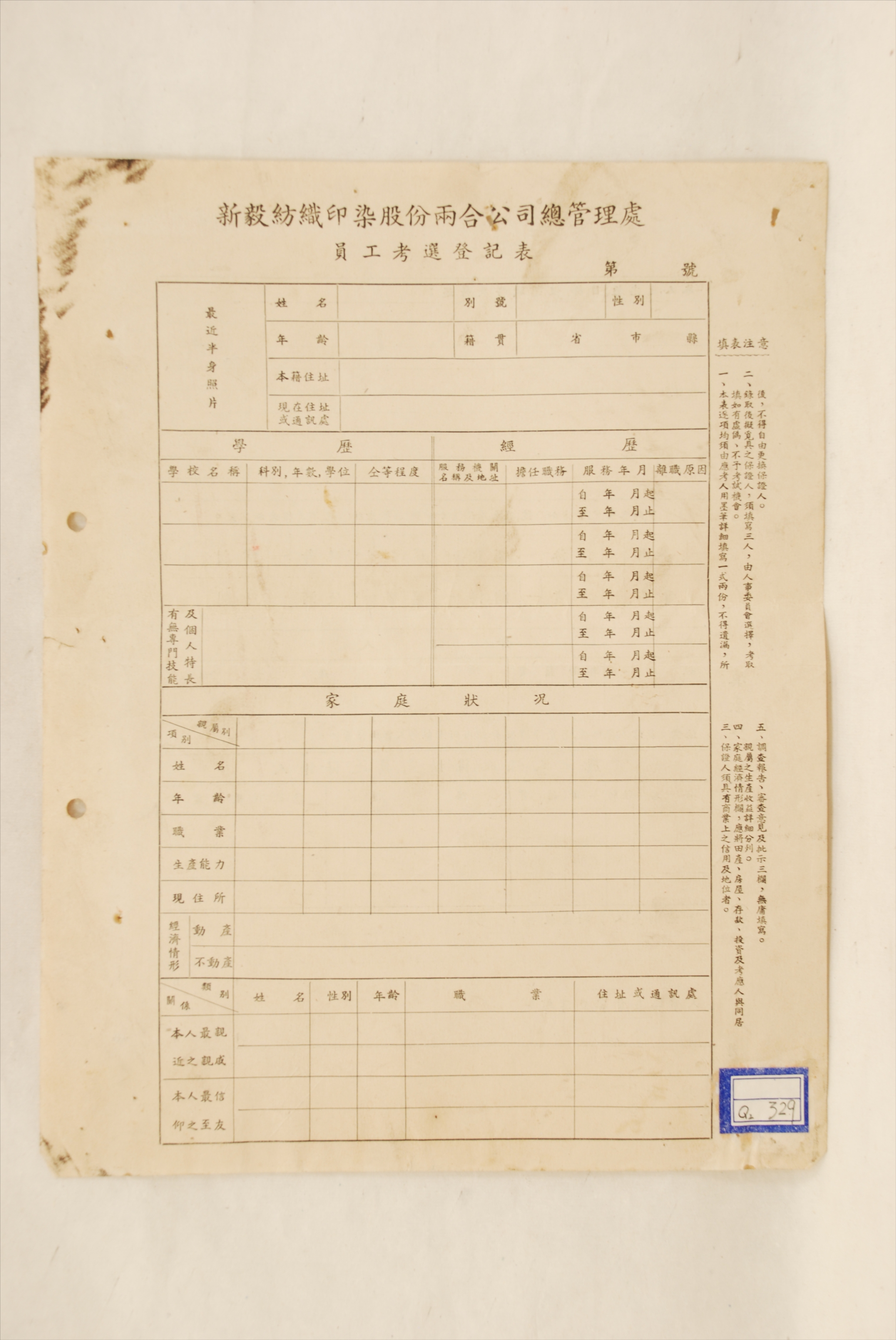 民国新毅纺织印染股份两合公司总管理处员工考选登记表