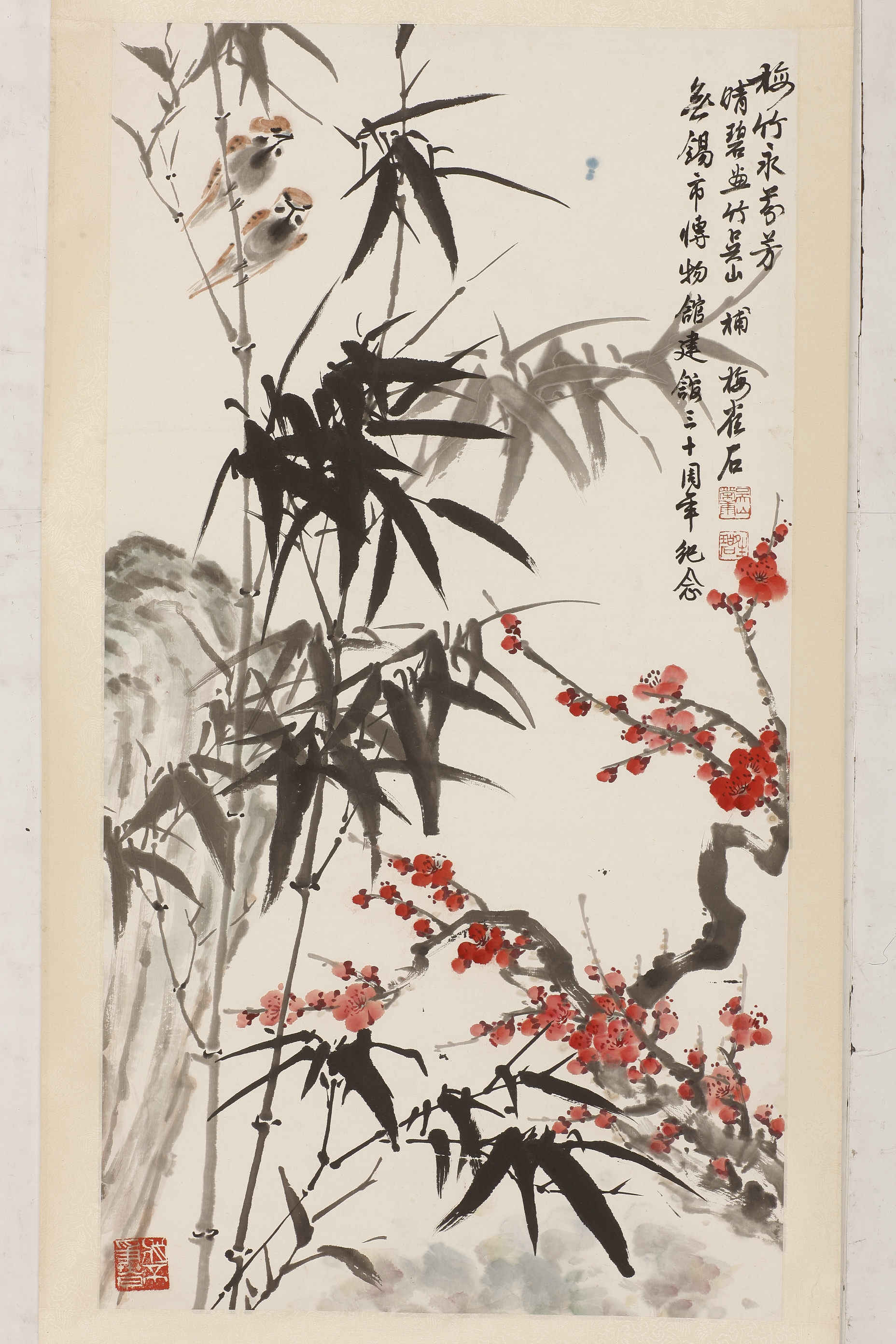 现代吴荣康、钱晴碧合作梅竹雀石图轴