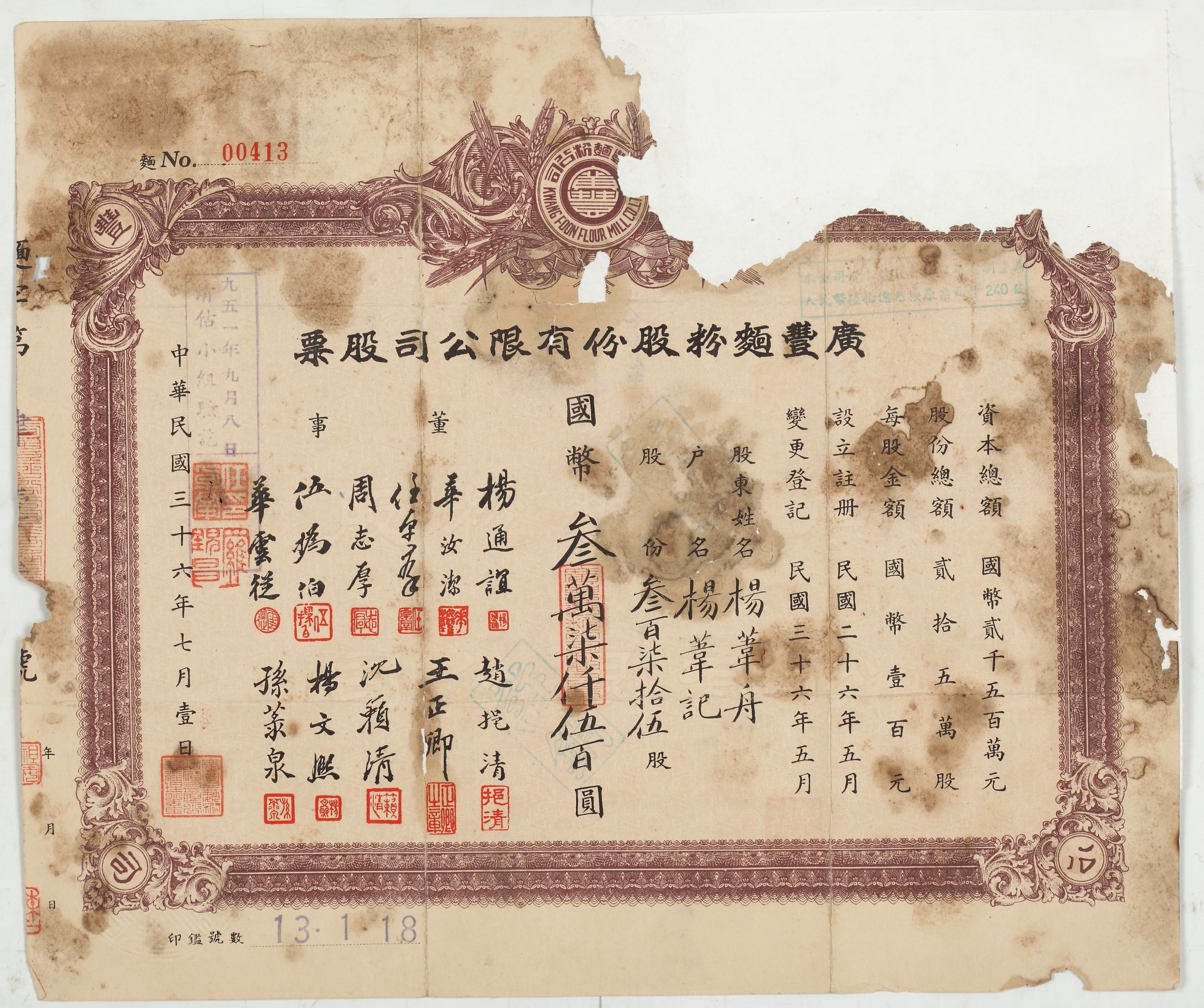 1947年7月1日广丰面粉股份有限公司出具给杨苇舟、杨苇记的股票