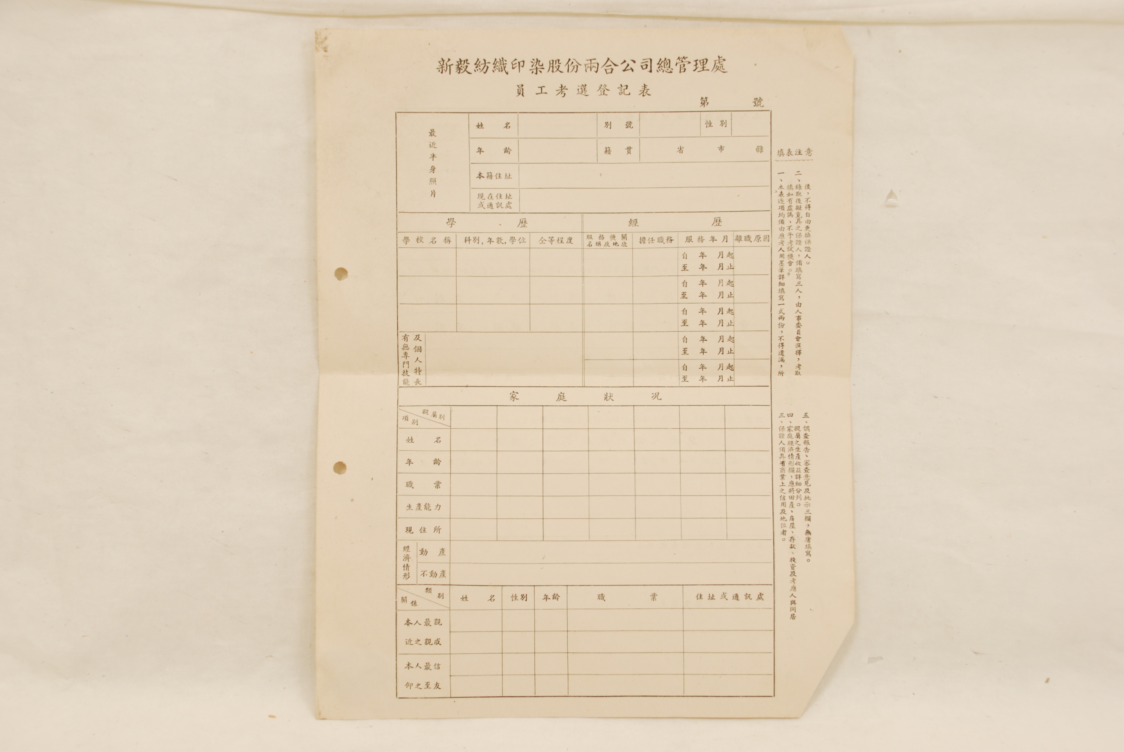 民国新毅纺织印染股份两合公司总管理处员工考选登记表